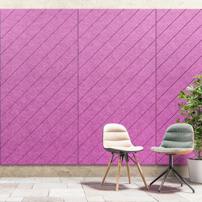 Panneau en feutre acoustique PET recyclé (≥ 60 %). Le relief diagonal diffuse, le feutre absorbe : moins d’écho, meilleure intelligibilité. Adapté aux bureaux, restaurants, halls et salles de réunion.
